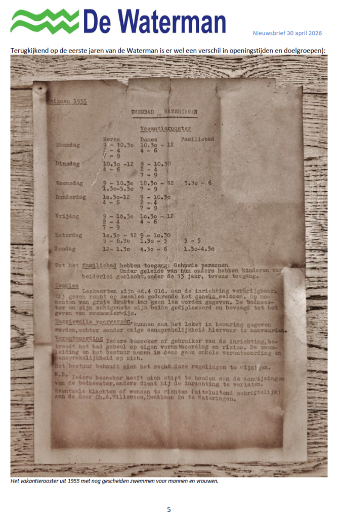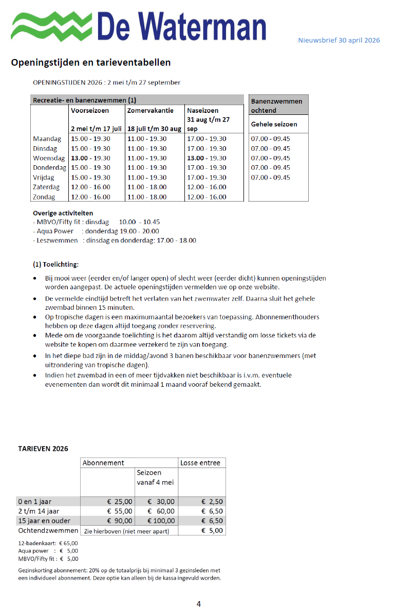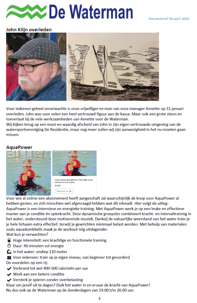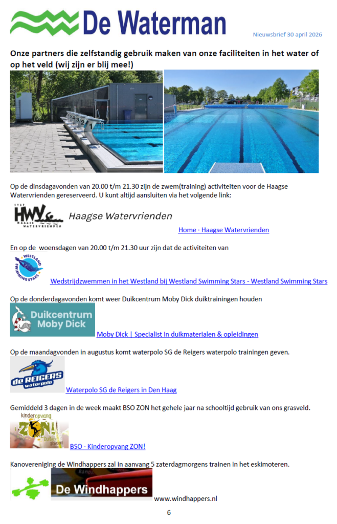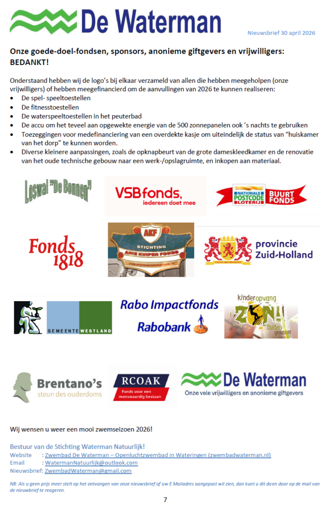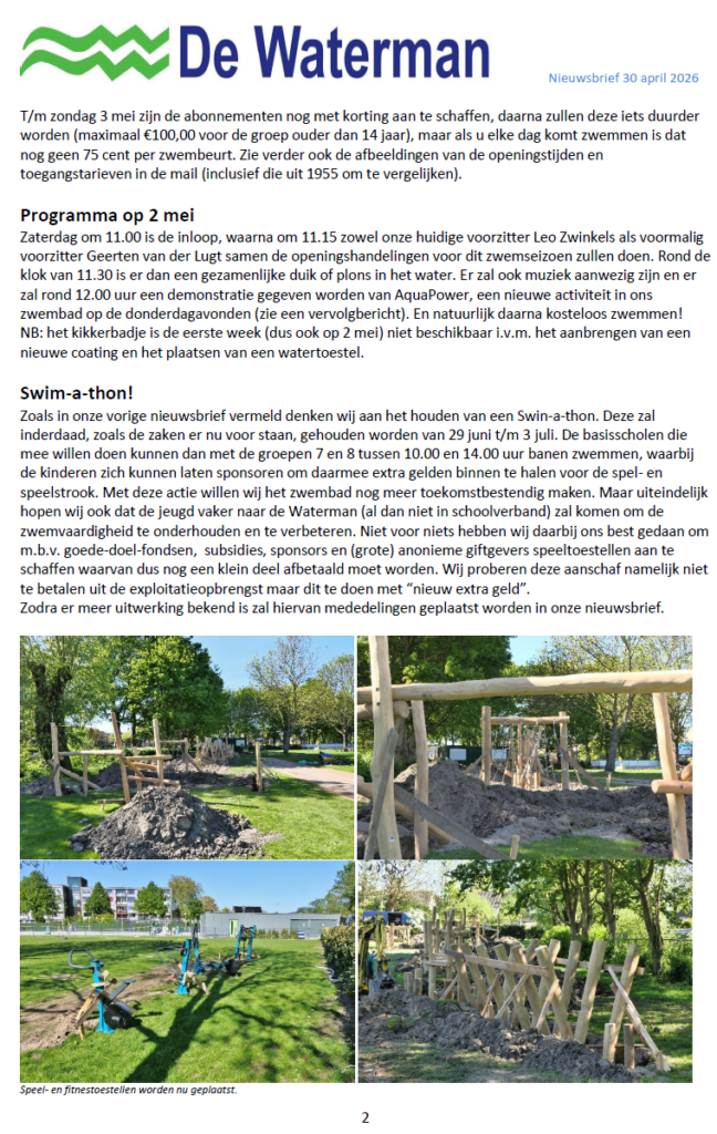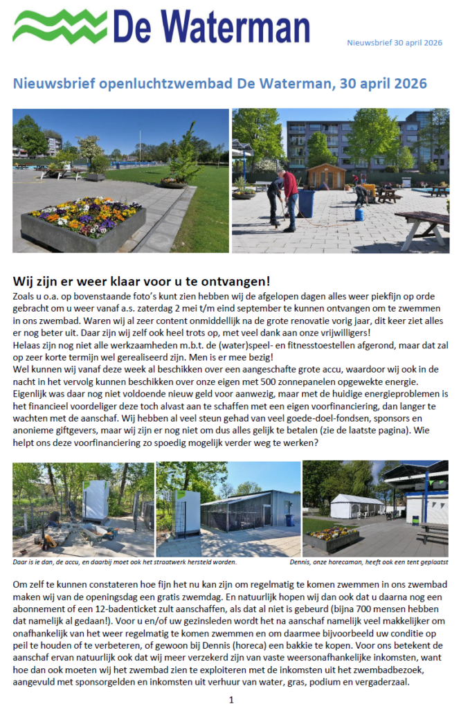 Nieuwsbrief van 30 april 2026 (start zwemseizoen 2026) Zwembad De Waterman Geplaatst op 30 april 2026 door Beheerder Waterman30 april 2026